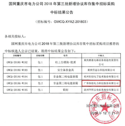 熱烈祝賀我司在國網重慶市電力公司2018年第三批新增協議庫存集中招標采購中標